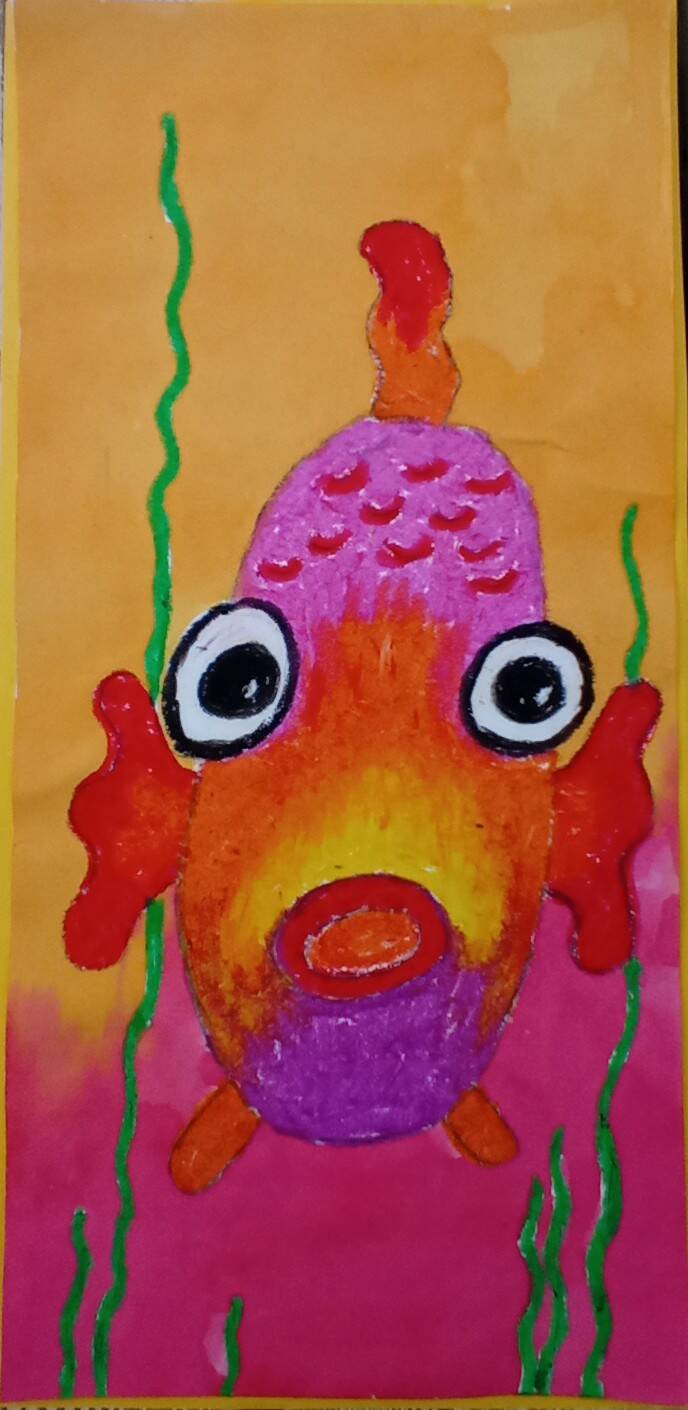 Laat de kinderen verschillende aanzichten zien van een voorwerp. We gaan in deze les niet het gebruikelijke zijaanzicht van de vis tekenen maar het vooraanzicht. Bedenk welke dingen van de vis dan zichtbaar zijn. Schets licht met potlood de vis. Gebruik verschillende kleuren vetkrijt om de vis in te kleuren. Let op bij de ogen. Eerst het wit en dan pas het zwart, dus ook eerst het lichtje in het oog. Zorg telkens voor een schoon en scherp puntje tijdens het tekenen met het vetkrijt. Daarna teken je de waterplanten die achter de vis langs gaan (overlapping). Vul vervolgens de achtergrond in met twee kleuren ecoline. Let op dat je je penseel uitspoelt voor je met een andere kleur begint.
