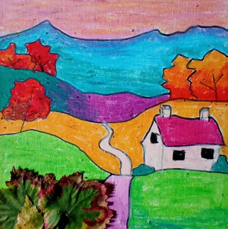 Laat enkele werken zien van Gillian Mowbray. Wat valt op. Wijs op de warme en koude kleuren die door hun afwisseling diepte creëren. Wijs op de gelaagdheid in het landschap en het steeds smaller worden van het pad, waardoor ook diepte ontstaat. Laat de kinderen zelf met potlood een landschap schetsen en met zwarte stift overtrekken. Vervolgens invullen met waskrijt. Maak dus gebruik van die warme en koude kleuren. Werk met een schoon krijtje en blaas kruimels weg. Plak op de voorgrond wat herfstblaadjes om nog meer diepte te krijgen.