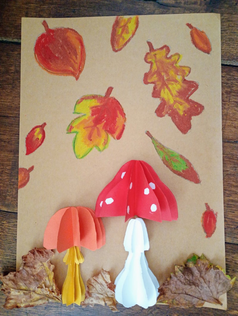 De paddestoelhoed bestaat uit 7 vierkantjes, vouw ze dubbel, plak ze op elkaar met de vouwnaden allemaal aan dezelfde kant, knip een halve paddestoelhoed, aan de dichte kant zodat de paddestoelhoed opengevouwen kan worden en een hele hoed vormt. De steel bestaat uit vijf blaadjes, plak ze ook op elkaar met de vouwnaden allemaal aan dezelfde kant. Knip aan de dichte kant een halve steel in de lengte uit met ook de paddestoelrok. Laat ze de vormen eerst schetsen, doe eventueel voor op het bord hoe dat een steel er door de helft uit ziet. Je kunt ervoor kiezen om 1 grote paddestoel te doen of twee kleine (dan heb je we meer papier nodig). Vervolgens worden eerst de herfstbladeren geschetst en ingekleurd met waskrijt. Laat de kinderen zien hoe je met afsnijding een mooi ruimtelijk effect krijgt, alsof de tekening ook buiten de randen nog doorgaat. Daarna plak je pas de paddestoelen op het papier! De kinderen moeten dus ook ruimte overhouden voor de paddestoelen al is het geen ramp als ze een stukje over de bladeren geen worden geplakt. Vul de onderrand met echte herfstblaadjes op. Veel plezier!