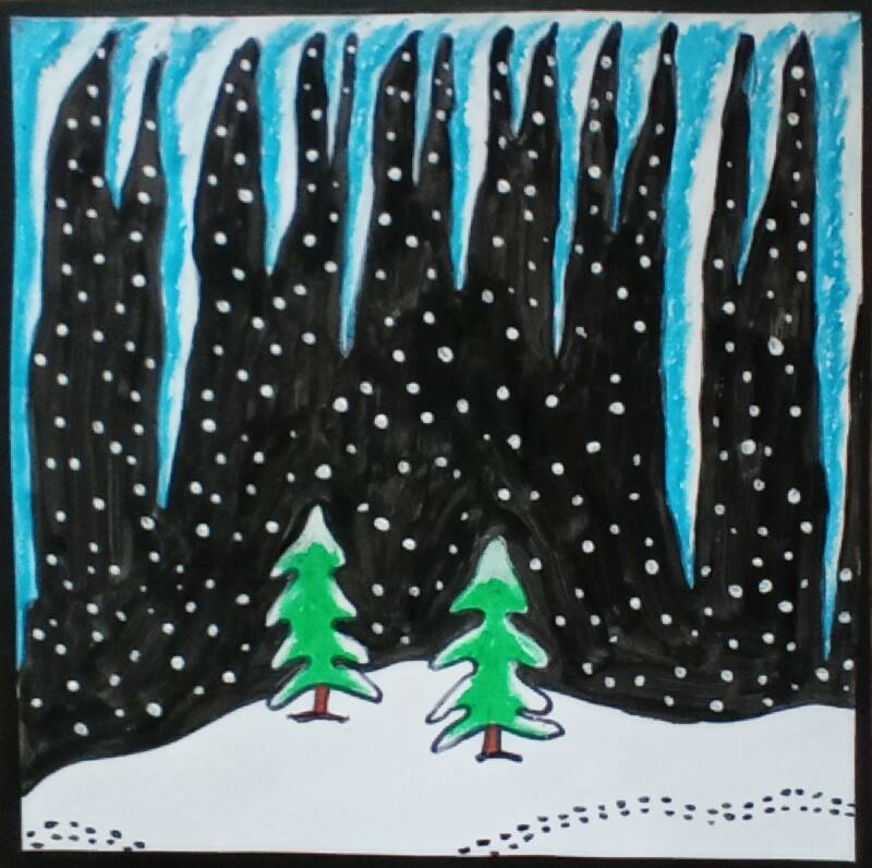 Begin met het schetsen van de ijspegels, aan de zijkanten lang en naar het midden toe korter, verspringende lengtes. De ruimte tussen de ijspegel loopt niet helemaal door tot de papierrand, wijs daar op. Daarna een lijn waar het sneeuwdek begint. Een aantal dennenbomen. Kinderen mogen zelf bepalen hoe ze die tekenen maar wel aan het randje van het sneeuwdek, om diepte te creëren. De ijspegels lijken daardoor dichtbij, alsof je onder een afdakje staat met ijspegels aan de dakgoot. Daarna wordt alles overgetrokken met permanente zwarte stift. Dan gaan we de ijspegels inkleuren. De ijspegel wordt links eerst een randje van boven naar beneden lichtblauw gekleurd. Dan een randje donkerblauw met een beetje zijwaartse streepjes zodat het een boller effect krijgt. Vervolgens het laatste stuk wit. Waarbij een vloeiende overgang wordt gemaakt van de kleuren. Wijs ook op hoe de bovenkant van de ijspegel niet de papierrand raakt maar met een puntig nichtje gaat. Daarna worden de dennenbomen ingekleurd, al dan niet met sneeuw erop. Daarna wordt met een fijn kwastje en zwarte plakkaatverf, de lucht zwart ingekleurd. Ook de voetsporen in de sneeuw en de streepjes waar de boomstammen in de sneeuw verdwijnen. Als laatste worden, met een dun kwastje, witte stipjes gemaakt op de zwarte achtergrond. Het sneeuwt! Plak er zwart papier achter voor een mooie lijst.
