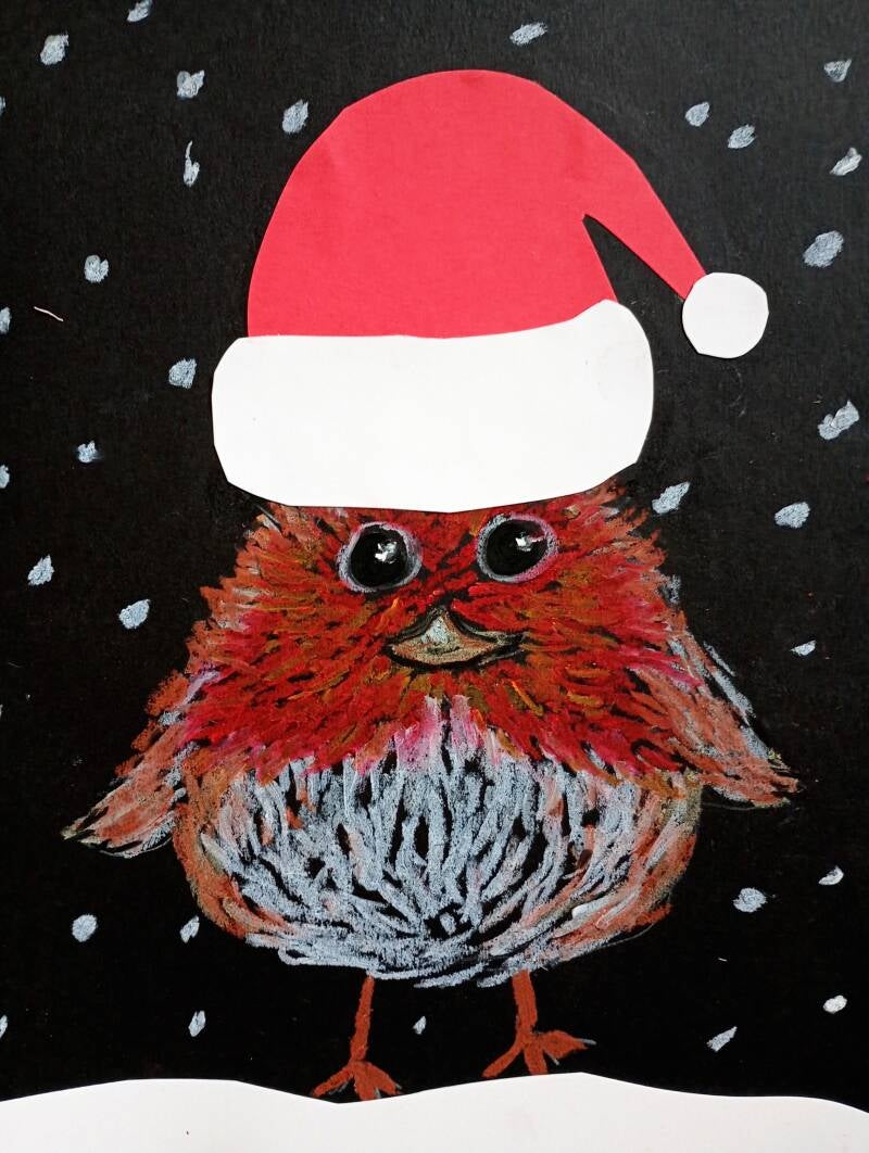 Bekijk enkele werken van Van Gogh die gemaakt zijn met streepjes (pointillisme). Laat dan voorbeelden zien van roodborstjes. Bespreek de ronde vorm, de grote ronde zwarte ogen, de kleur tekening. Hoe komt het dat deze vogel ons aan winter/kerst doet denken? Dan laat je zien hoe je de vogel tekent. Schets met grijs of wit een soort van avocado vorm, maar dan nog wat breder en ronde aan de bovenkant. Maak de vogel niet te klein! Hou rekening met het feit dat er nog pootjes onder komen en laagje sneeuw. En boven het kopje komt nog een muts. Begin dan met de grote ronde zwarte ogen. Zet er met wit waskrijt een stipje in en omtrek ook met wit. Let op, waskrijt en zeker zwart waskrijt geeft snel vlekken op je vingers, dus maak daarna eventueel je handen schoon. Daarna wordt het snaveltje getekend met bruin. Laat zien hoe je een vooraanzicht tekent. Breng ook een licht vlekje aan op de bovenkant van de snavel. (Lagere groepen kunnen eventueel een snaveltje van bruin papier knippen die dan uitsteekt uit de tekening.) Omlijn met zwart. Dan wordt met oranje/rode streepjes het gezichtje gemaakt vanuit de snavel naar buiten toe werken. Druk flink op het krijtje zodat het mooie felle kleuren worden. De buitenste rand wordt bruin en onder het rood van de borst wordt met wit een mooi rond buikje gemaakt. De vleugeltjes zijn ook bruin en de buitenste rand van het buikje is ook bruin. Werk met mooie kleine streepjes die elkaar mogen overlappen. Ik heb nog wat accent streepjes met zwart aangebracht bij de vleugeltjes. Teken met bruin waskrijt de pootjes waarbij je rekening houdt dag er nog een laagje sneeuw onder komt. Dat knip je uit wit papier. Vervolgens wordt het vogeltje aangekleed voor de winter met een muts. Ik heb een kerstmuts gemaakt maar natuurlijk kunnen er ook andere kleuren mutsen worden geknipt uit papier. Plak de muts op en maak tenslotte met wit waskrijt sneeuwvlokjes. Probeer met waskrijt zo schoon mogelijk te werken. Veeg niet met je hand over het papier maar blaas de kruimeltjes weg en was zo nodig je handen. Veel plezier!